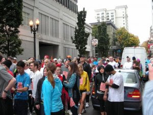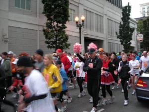 Descansé y empecé a sentirme un poco mejor. Me desperté a las 6 a.m. para prepararme para el Día de la Carrera! Comí un tazón de cereal y nos dirigimos al centro. Era un día particularmente frío en Portland, y no me sentía al 100% todavía. Una vez que se disparó el arma y comenzó la carrera, me concentré en correr.